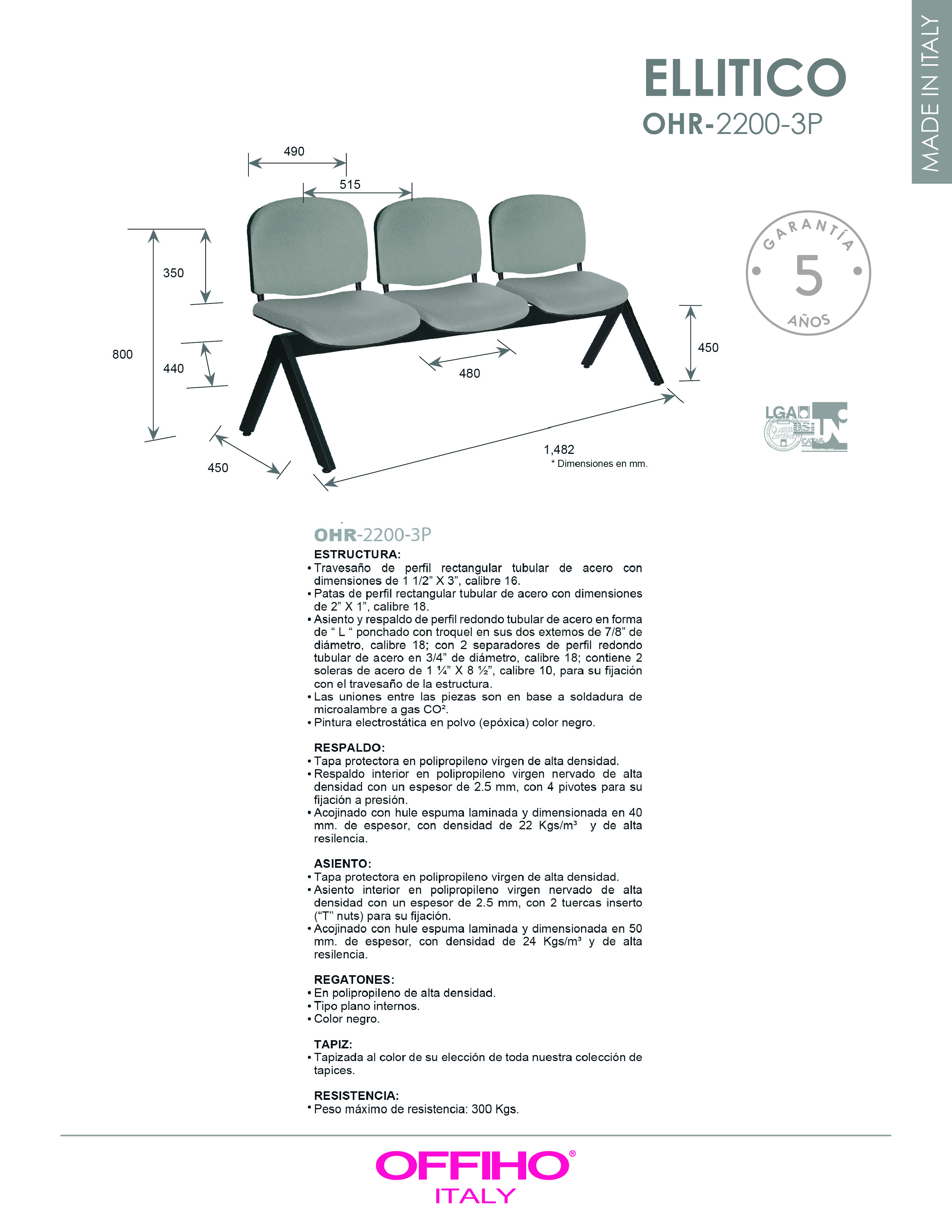 hule espuma laminado flexible con densidad en el respaldo de 22 kgs/m3 y de 24 kgs/m3 en el asiento y alta resiliencia.