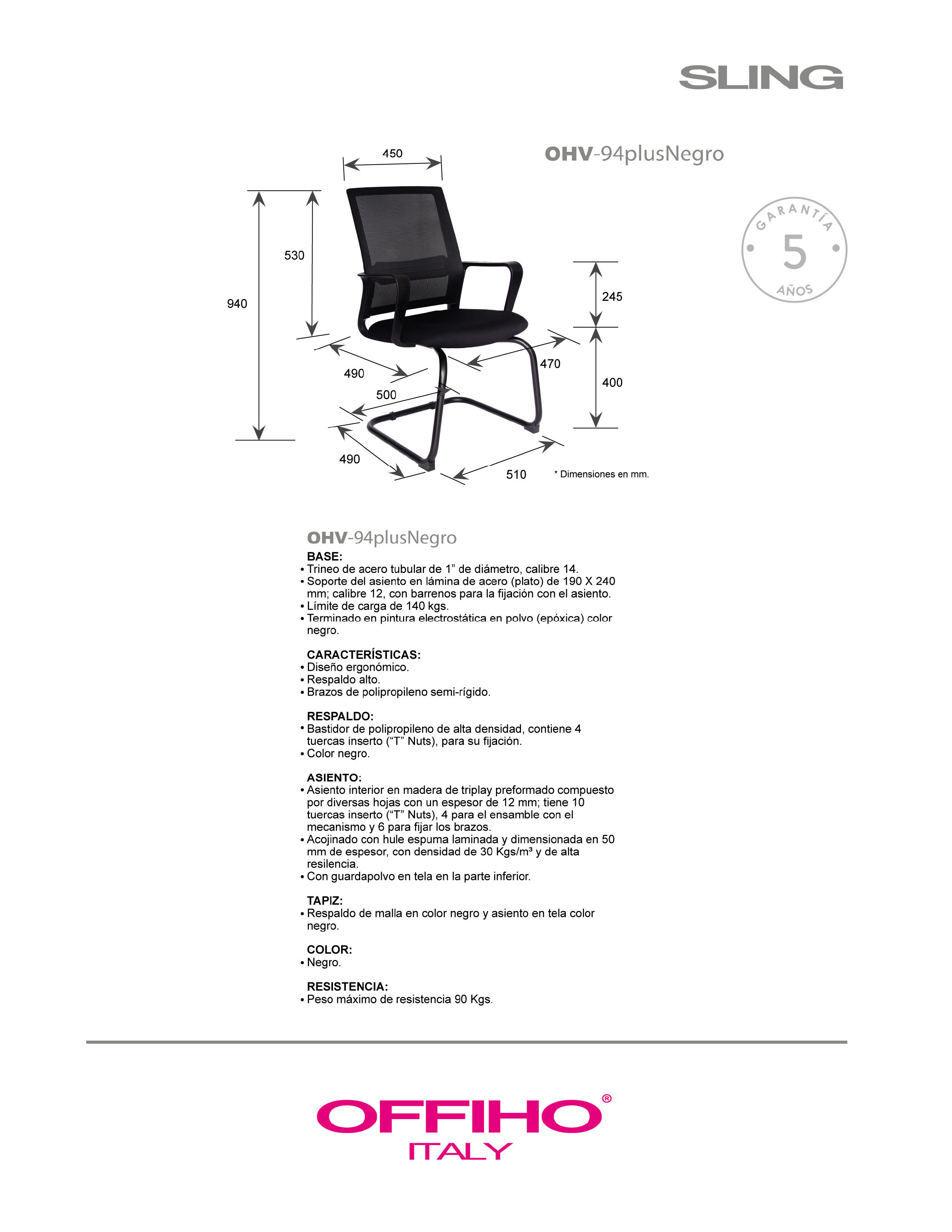 trineo de acero tubular de 1" de diámetro, calibre 14; soporte del asiento en lámina de acero (plato) con acabado de pintura epóxica (electrostática) color negro mate.