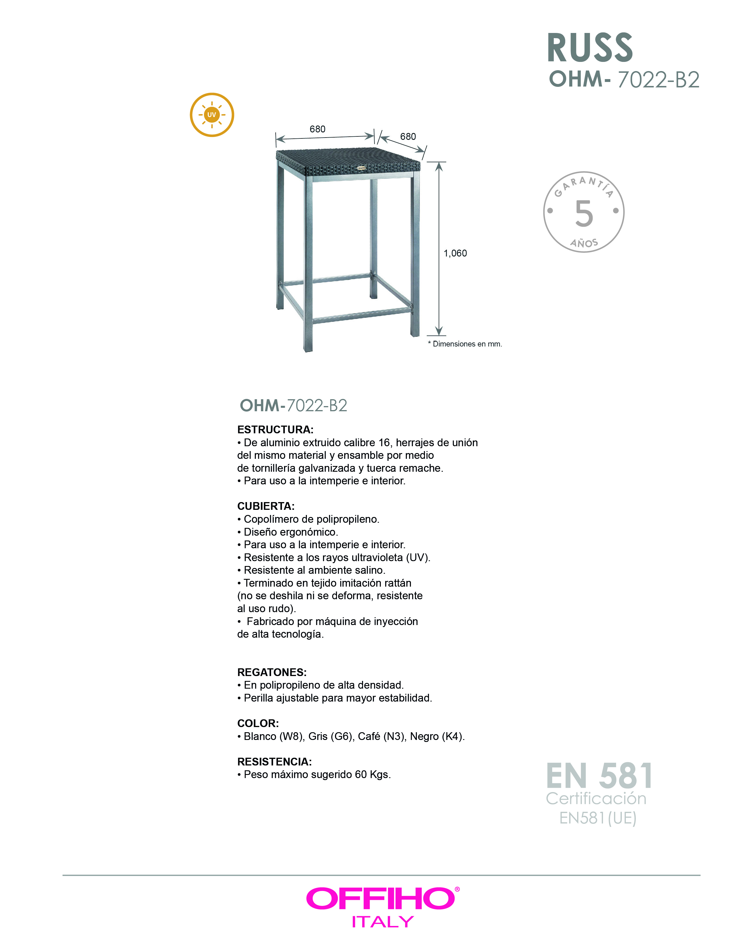 En copolímero de polipropileno, diseño ergonómico; para uso a la intemperie e interior. Resistente a los rayos ultravioleta (UV) y al ambiente salino.